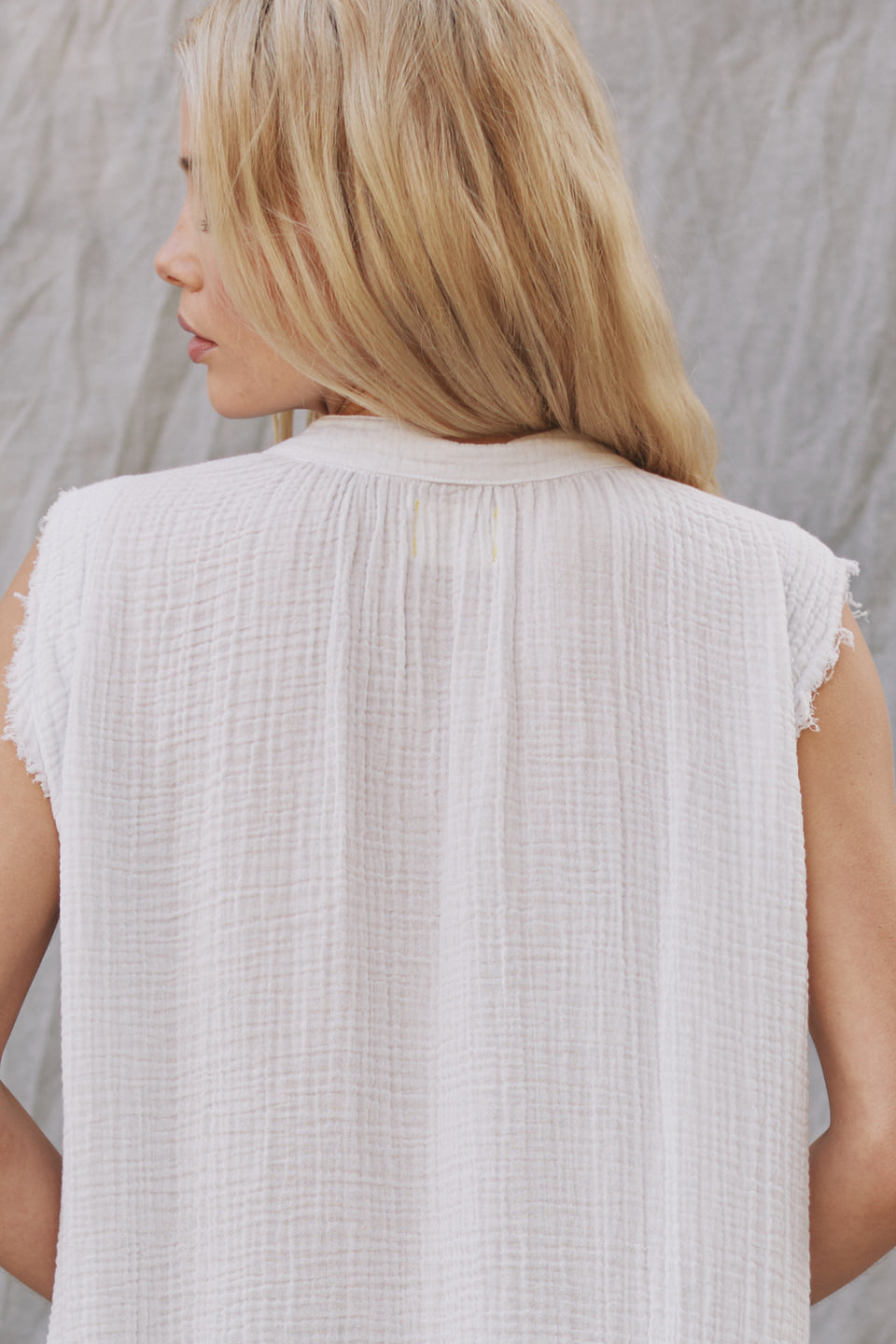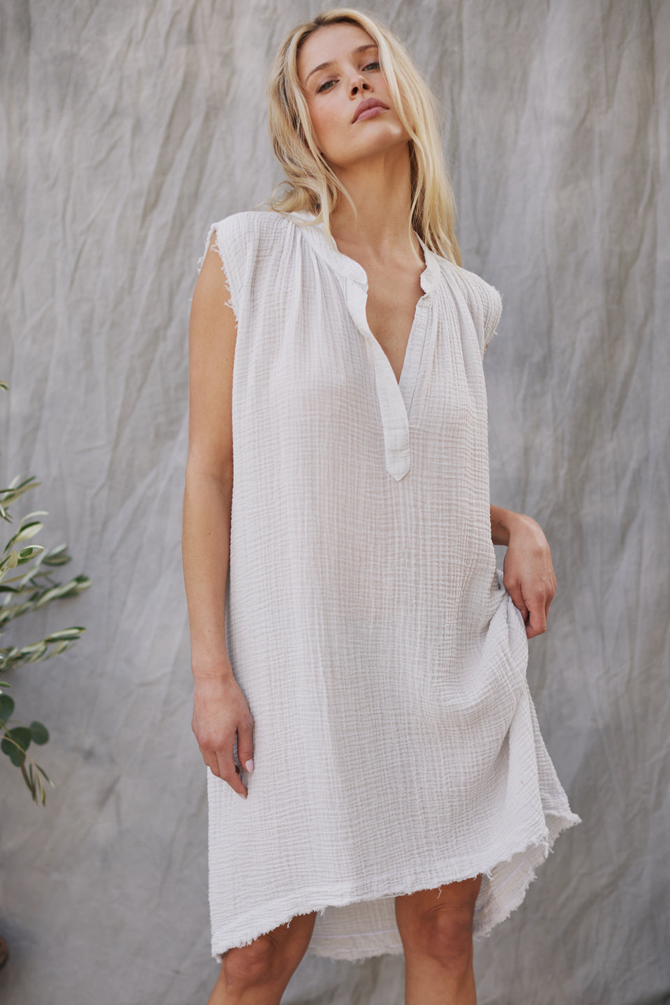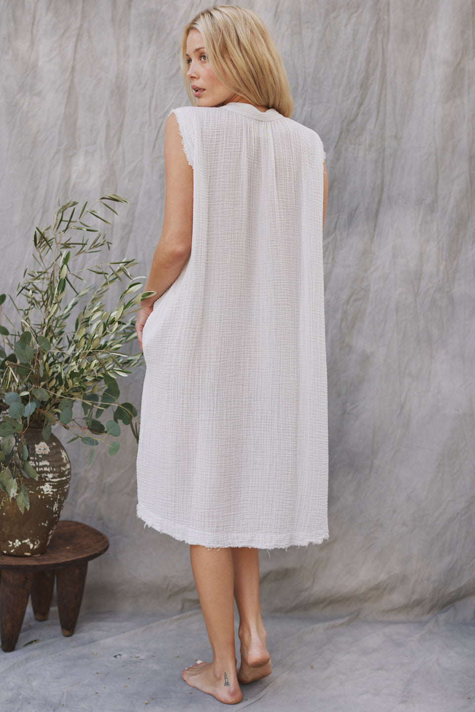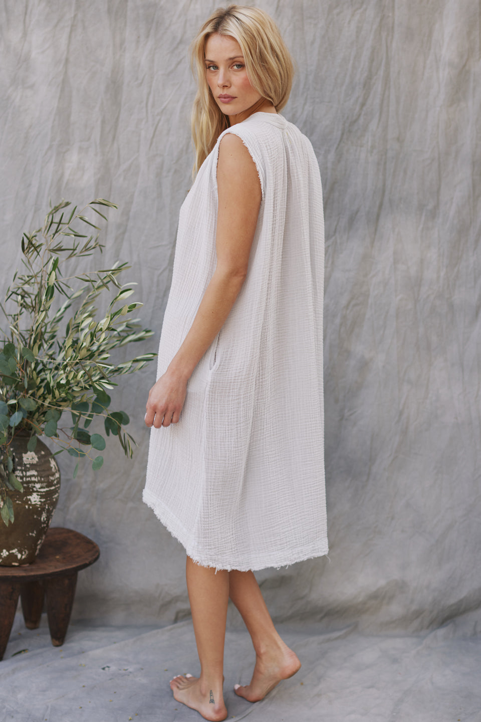 Our sleeveless caftan featuring on-seam pockets, raw edges and V neckline.