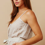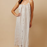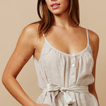 In soft washed Italian linen, the ankle-grazing Majorca Linen Dress features a gathered scoop neckline, slender straps and a breezy silhouette with an adjustable self belt. Shell button details extends down the front