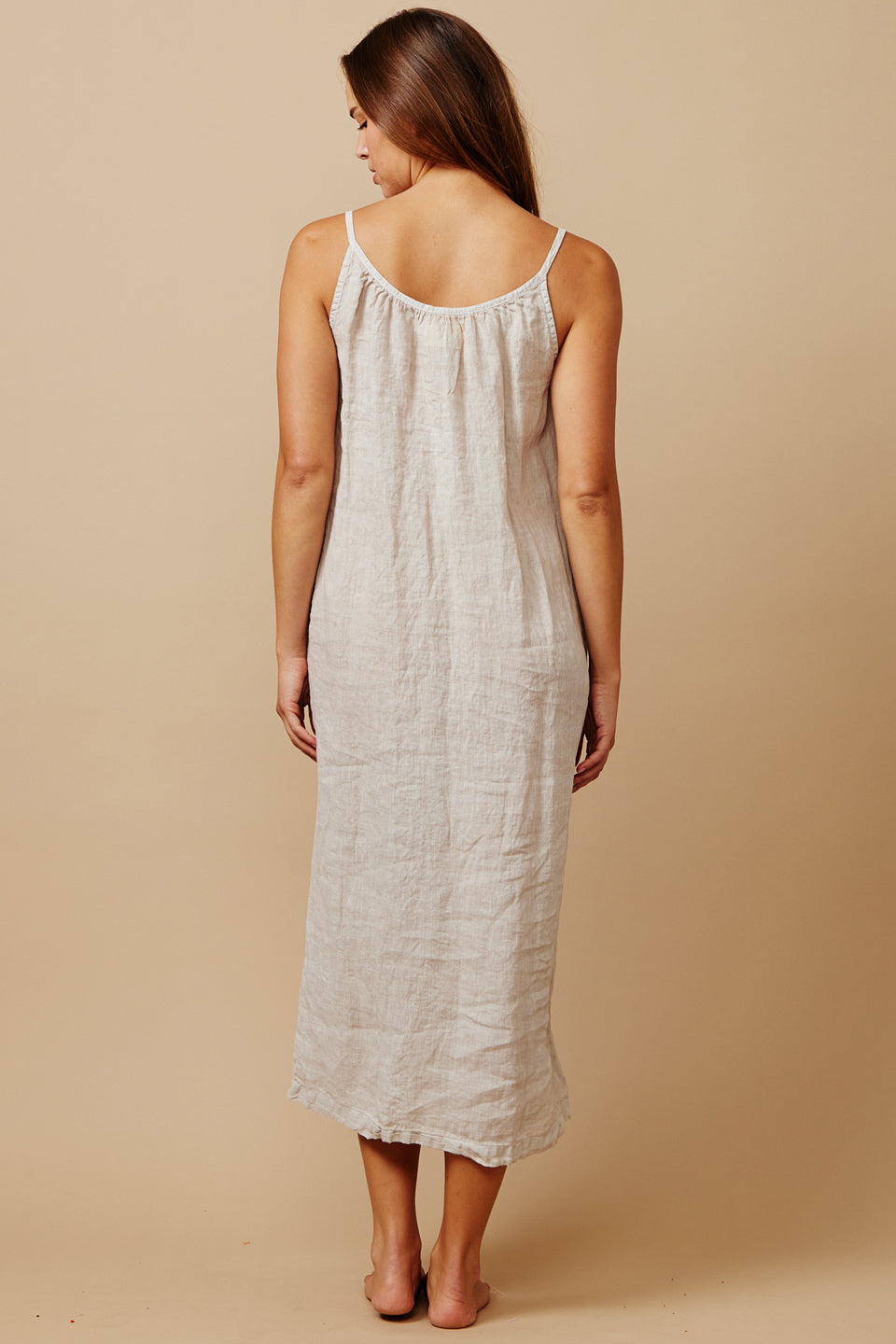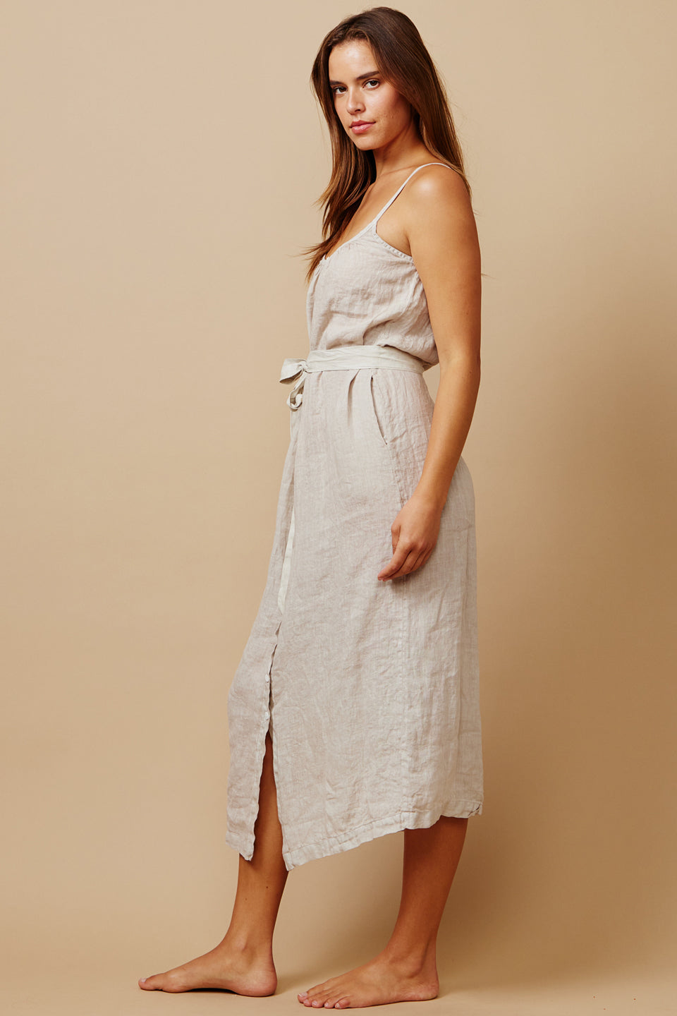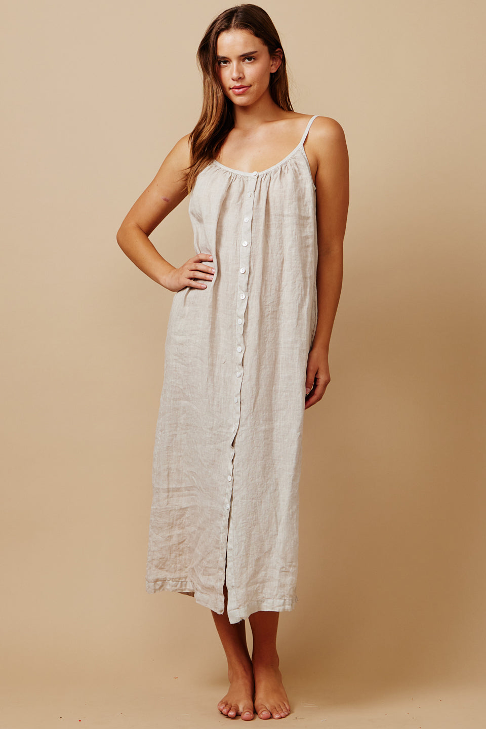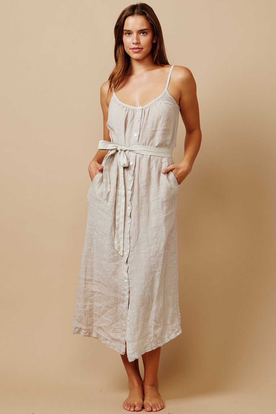 In soft washed Italian linen, the ankle-grazing Majorca Linen Dress features a gathered scoop neckline, slender straps and a breezy silhouette with an adjustable self belt. Shell button details extends down the front