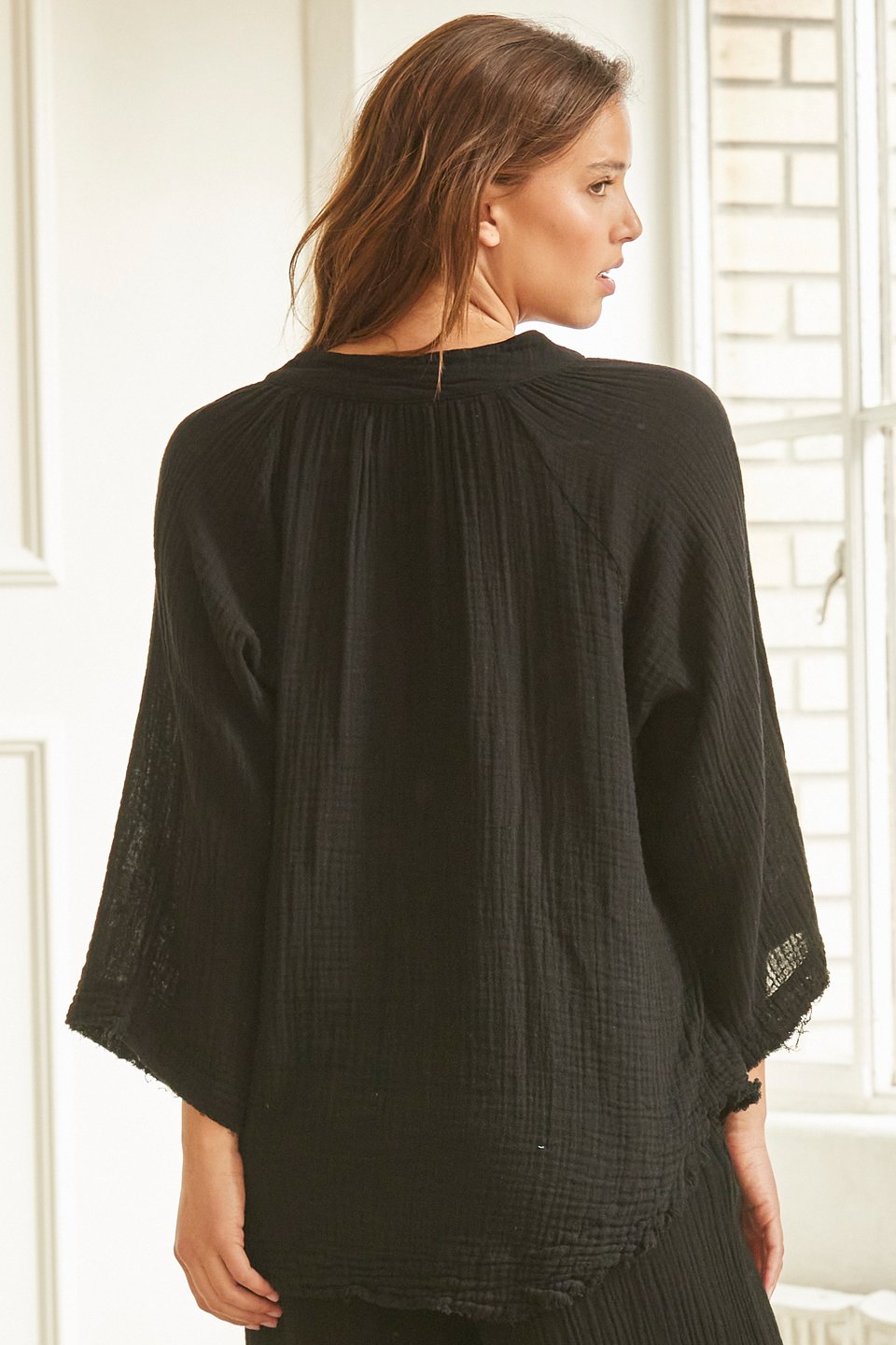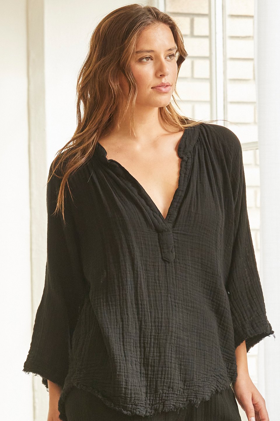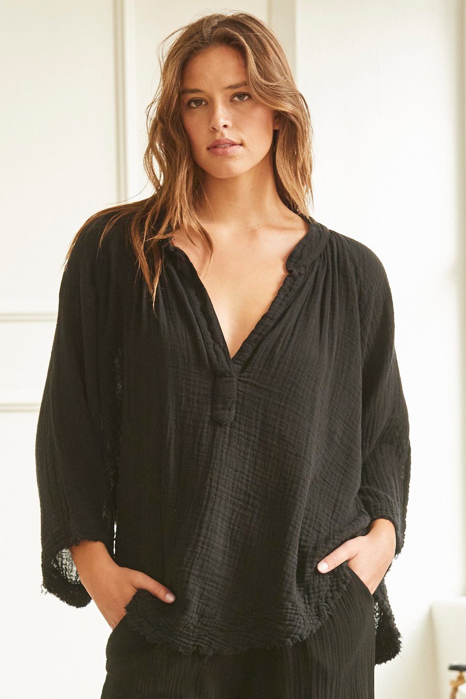A dashiki cover-up top in lightweight gauze. Split neckline. Raglan half sleeves. Frayed, curved hem.