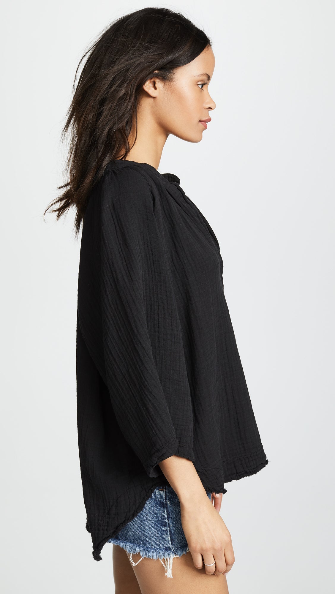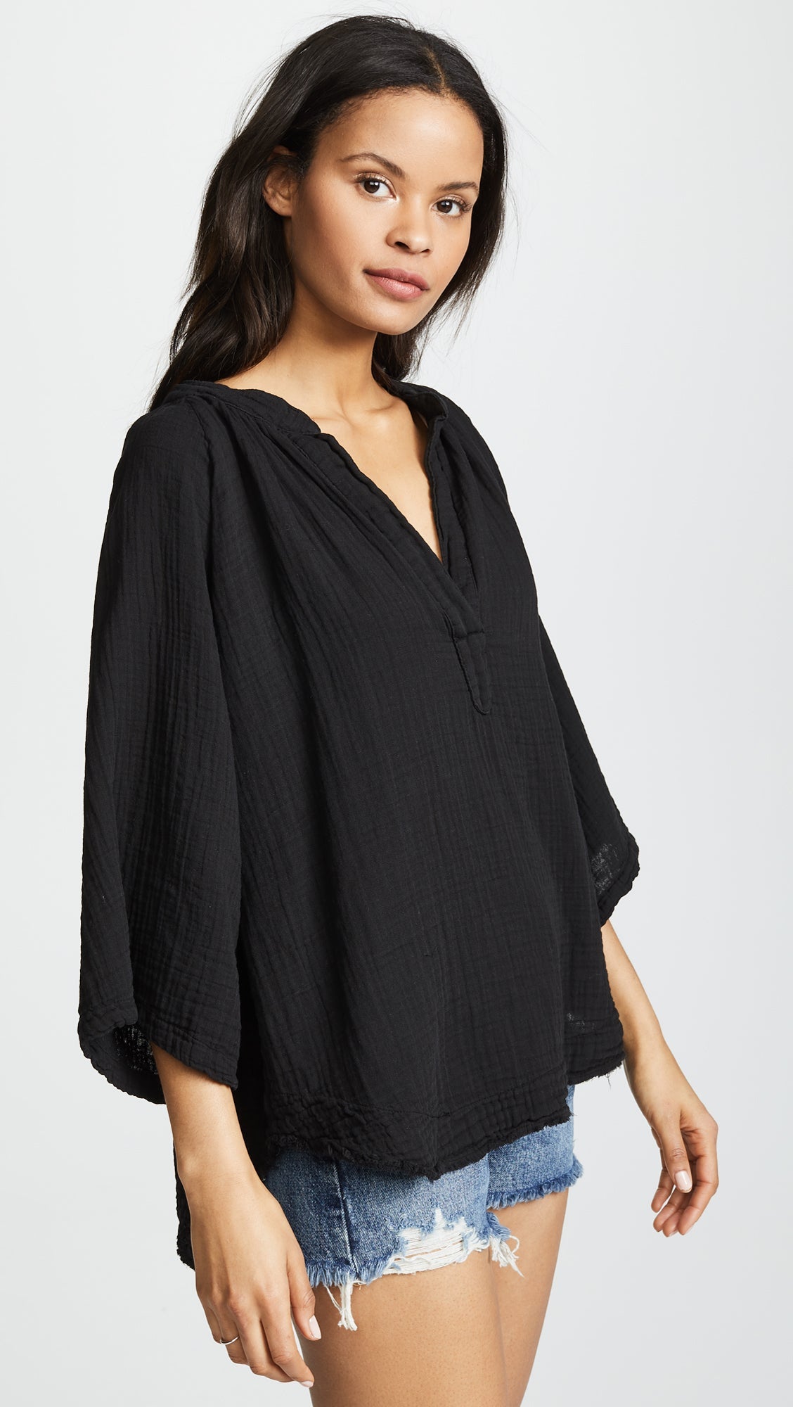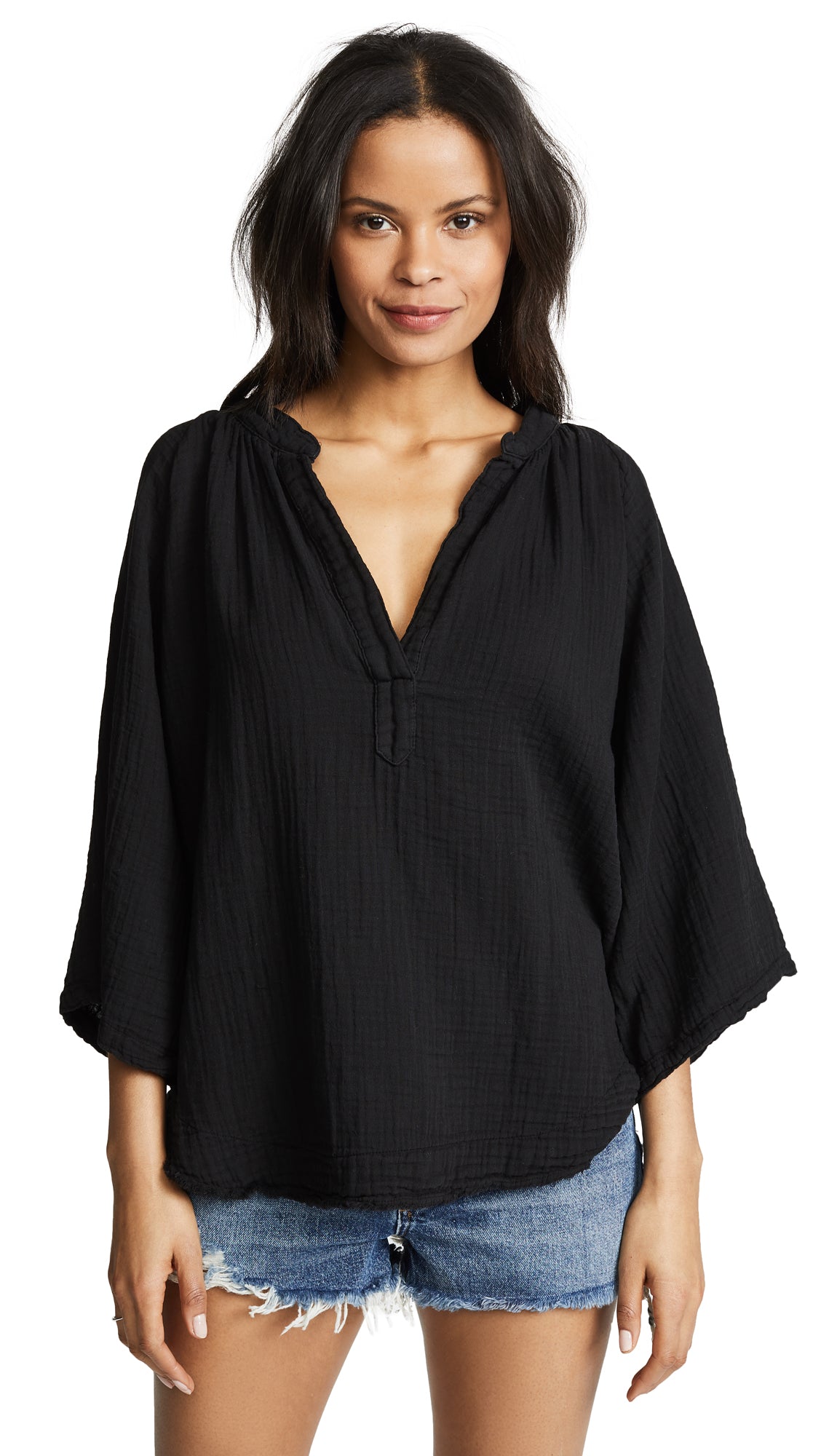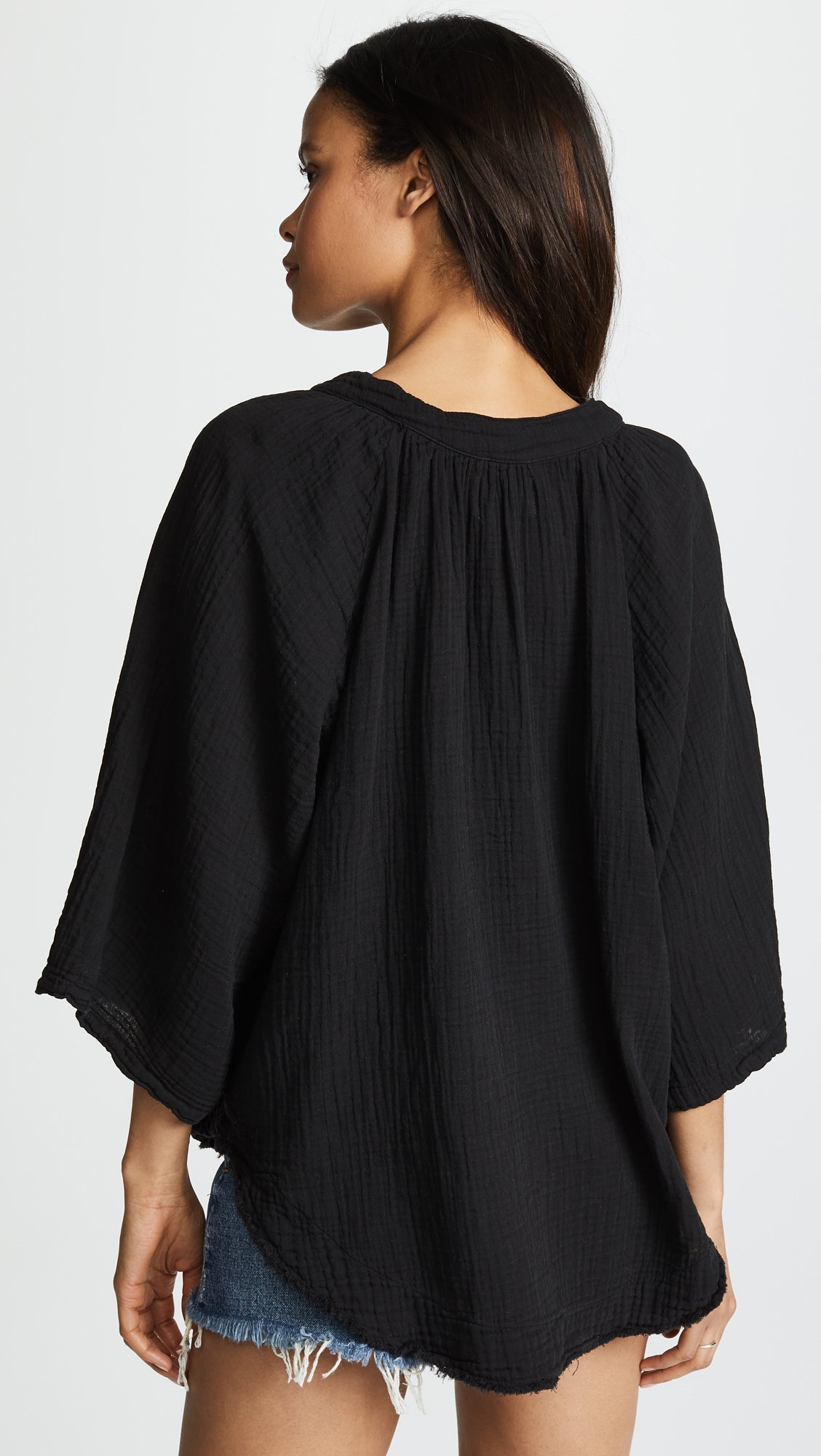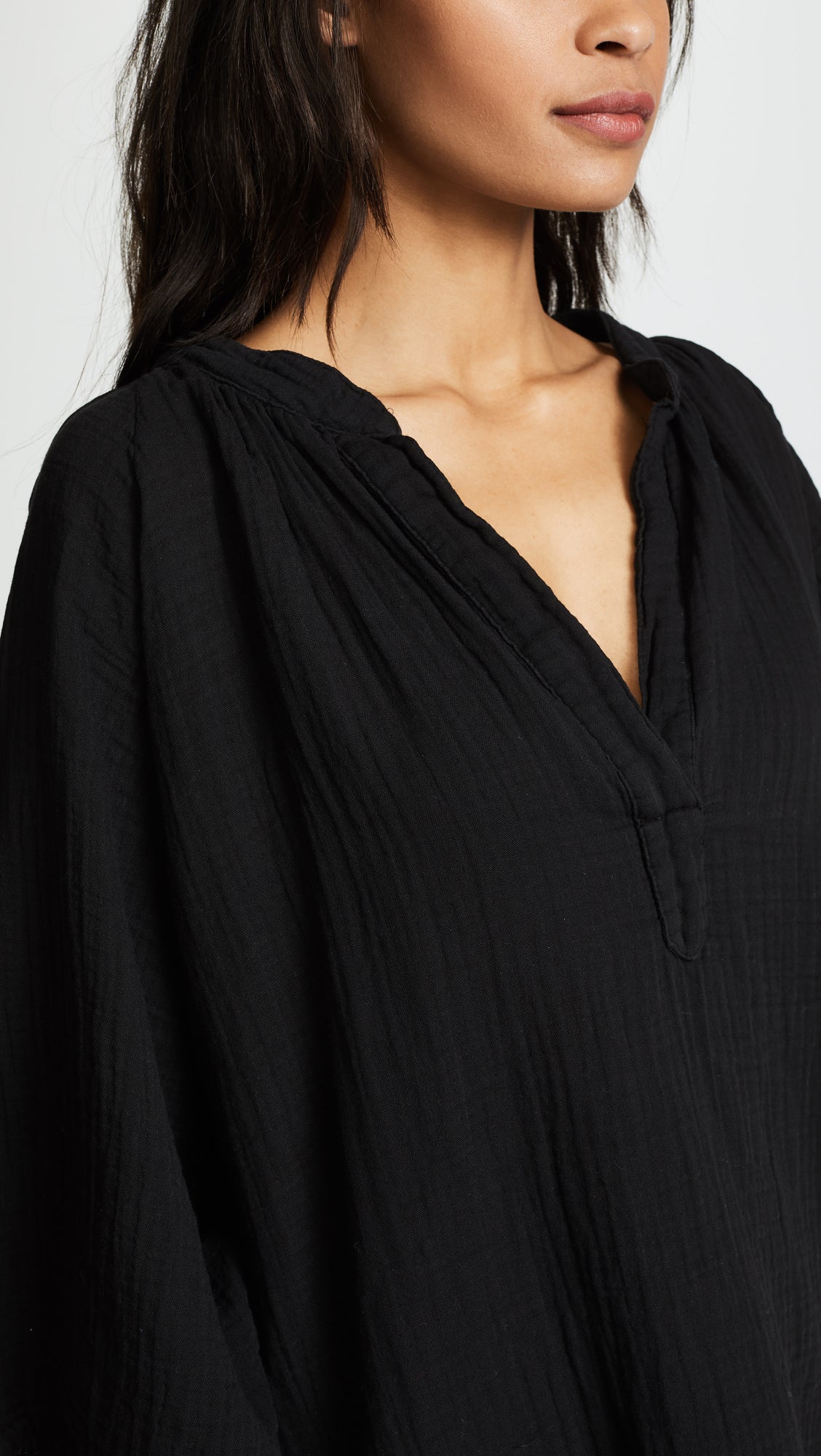 A dashiki cover-up top in layered double-gauze. Split neckline. Raglan half sleeves. Frayed, curved hem.