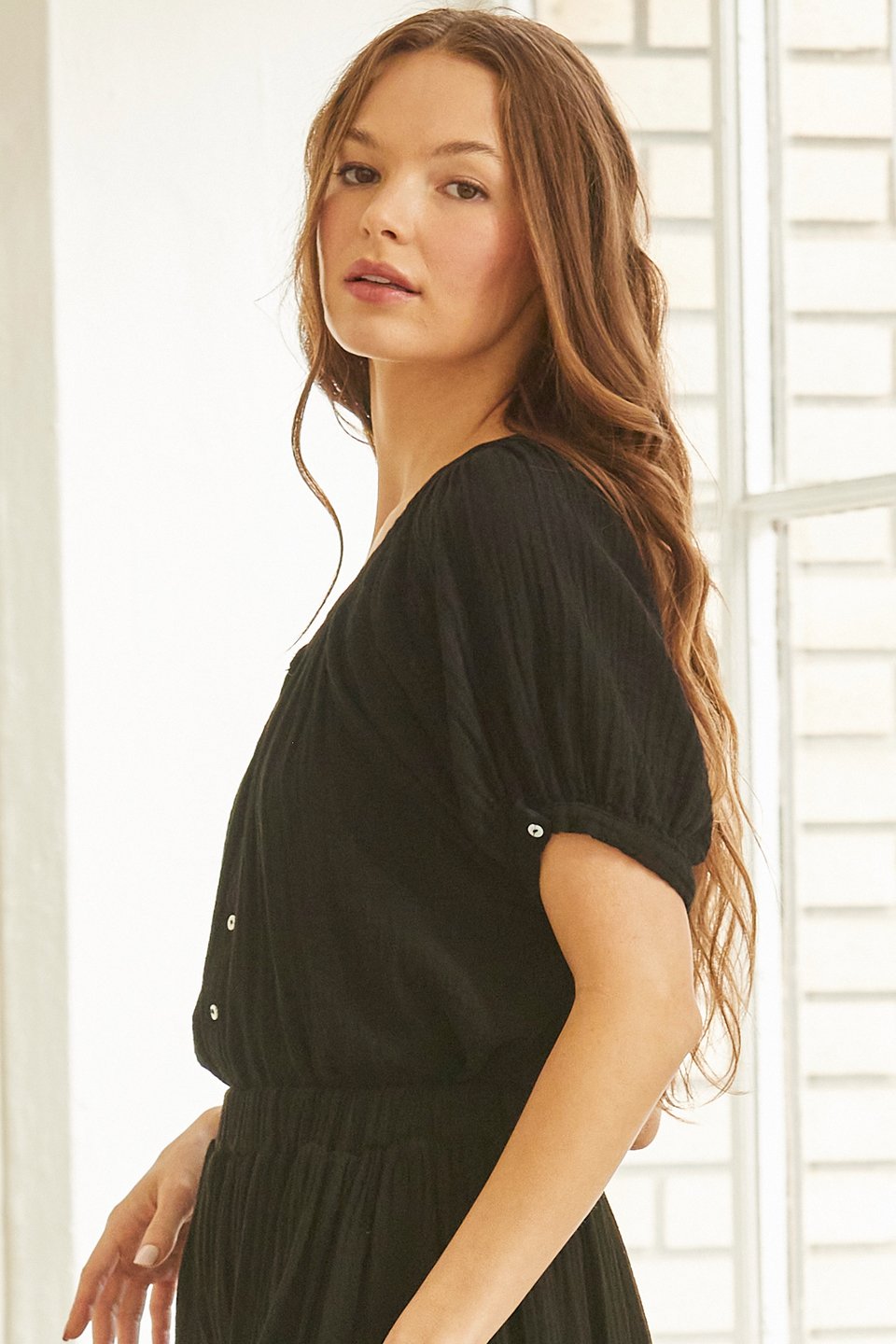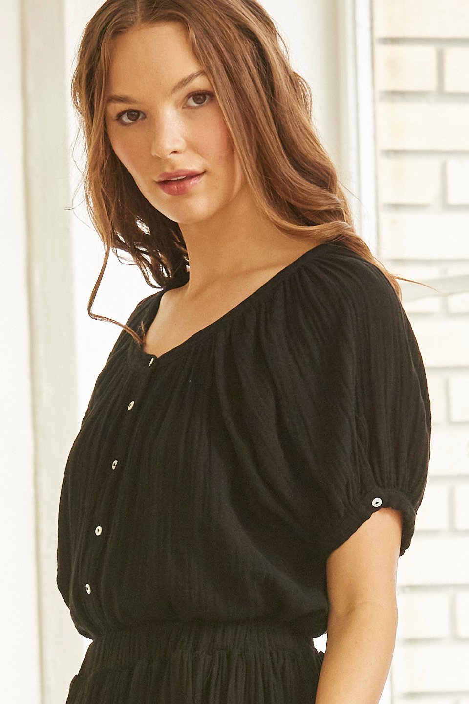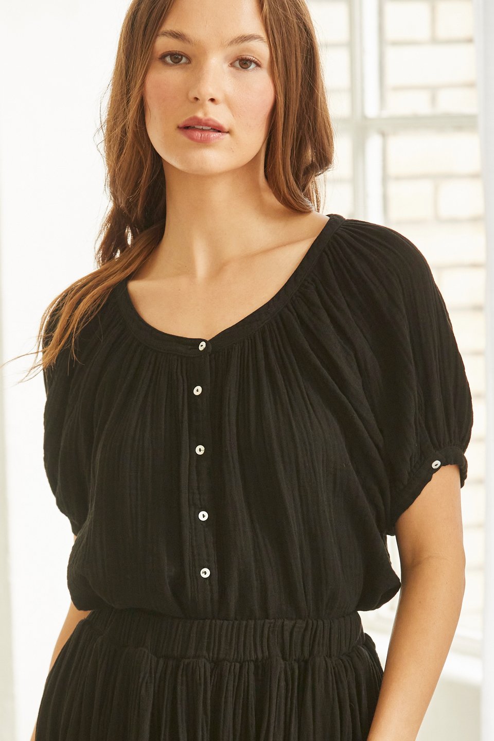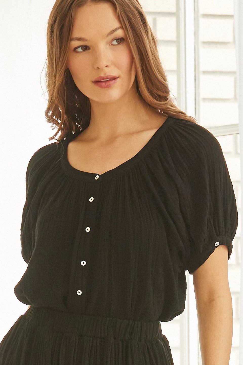 Our new Montecito gauze button down top. Banded neck, short puff sleeves and front button closure