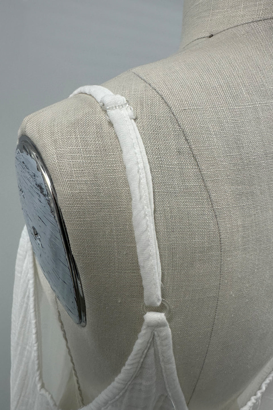 Our best selling maxi in lightweight gauze with a raw edge on the bottom hem. Semi-sheer. Now with adjustable straps.