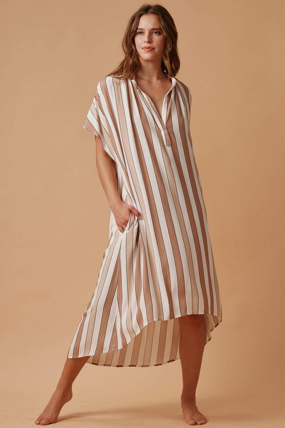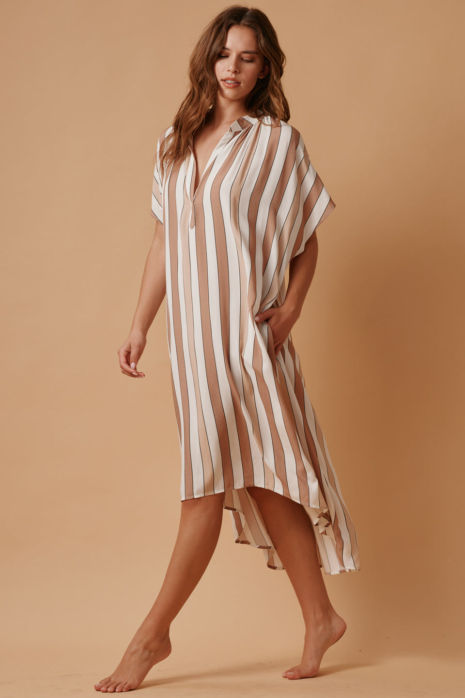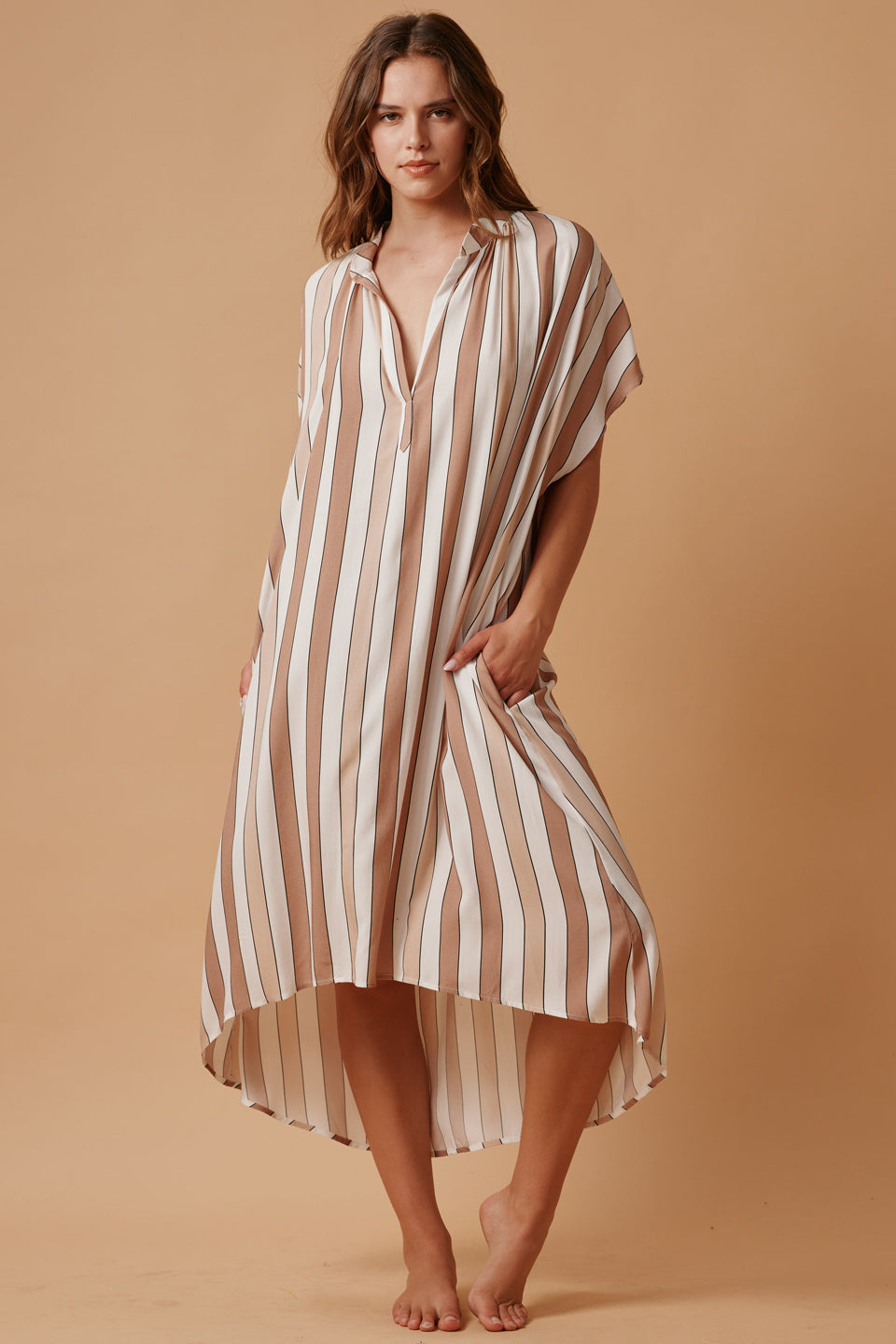 Our best selling caftan featuring on-seam pockets, raw edges and V neckline. Short sleeves.
