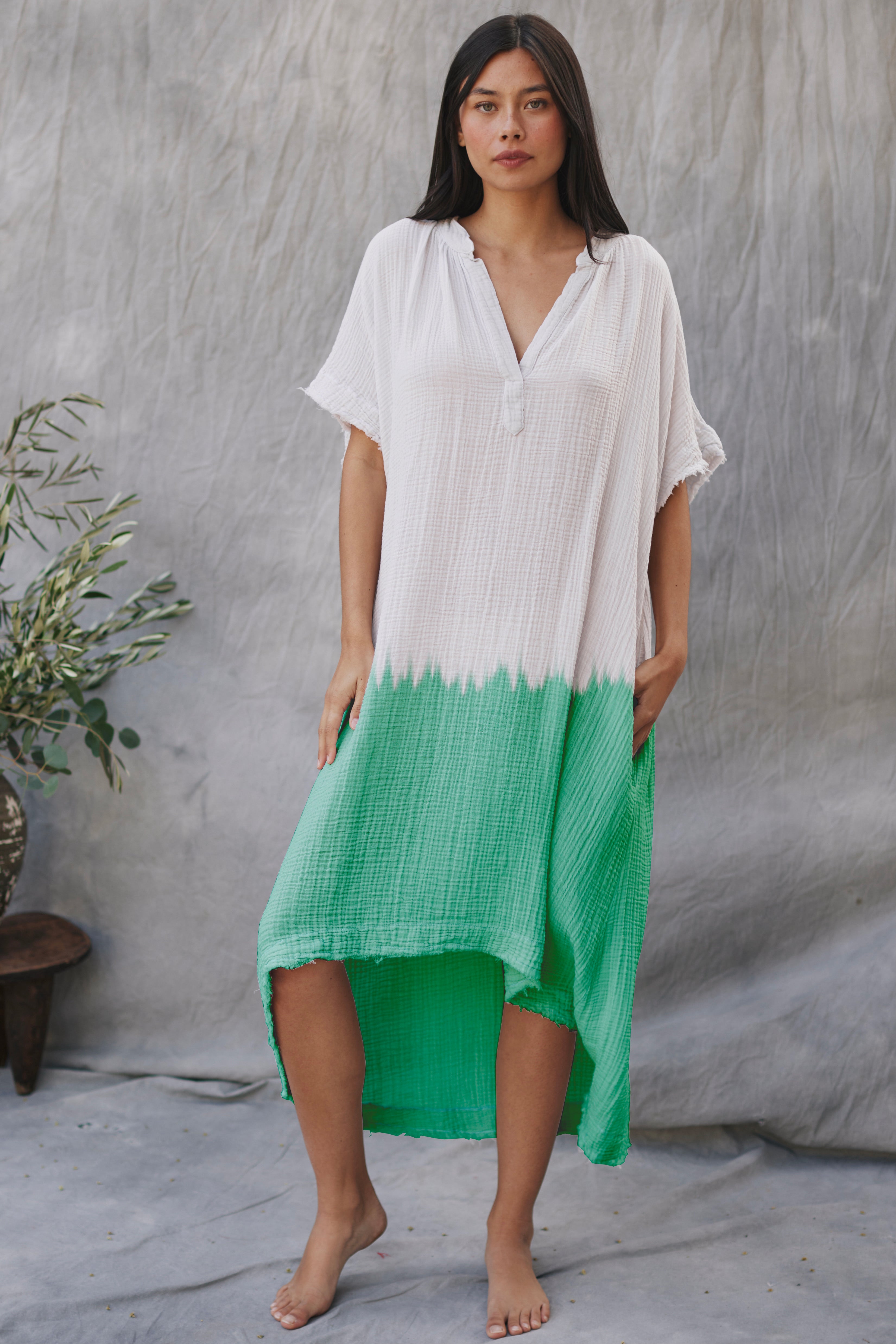 TUNISIA short sleeve caftan in lightweight gauze - grass is greener tie dye